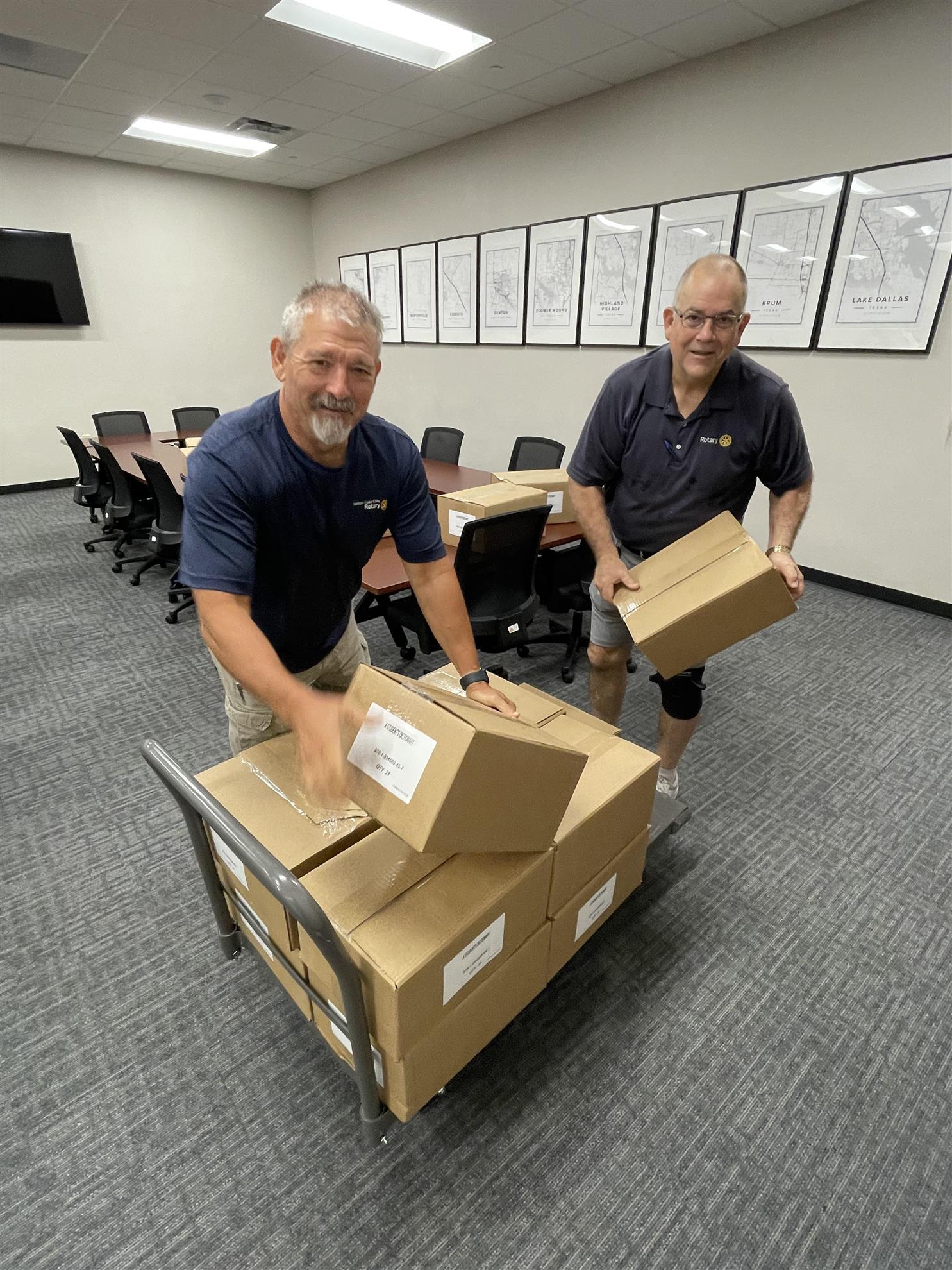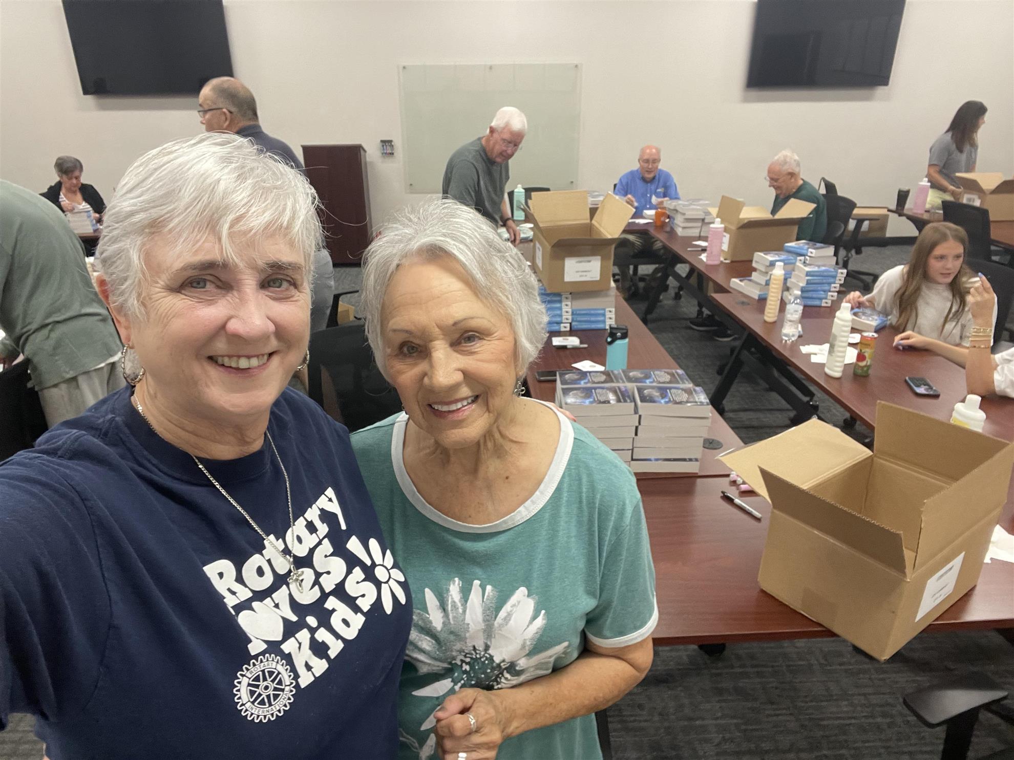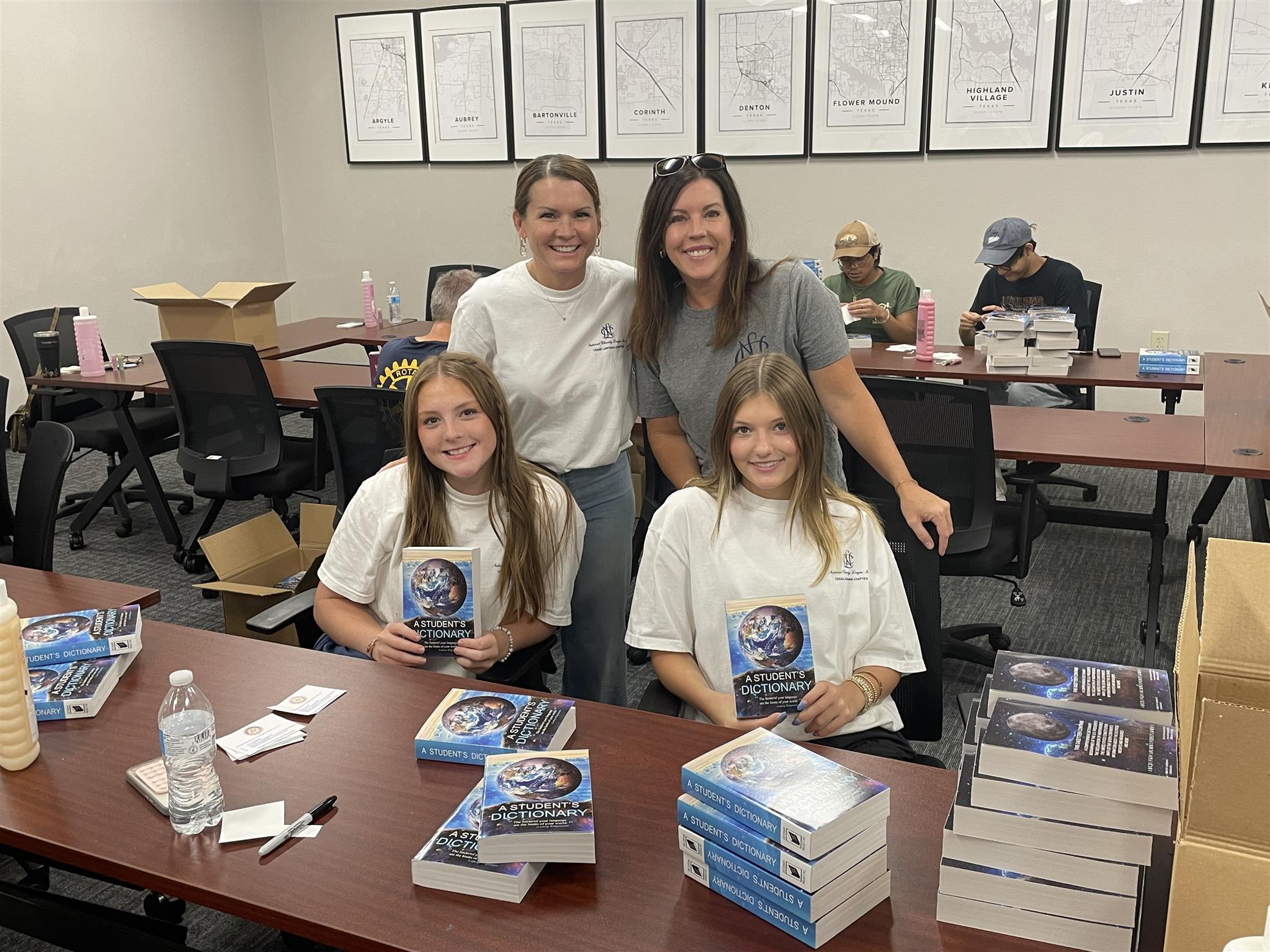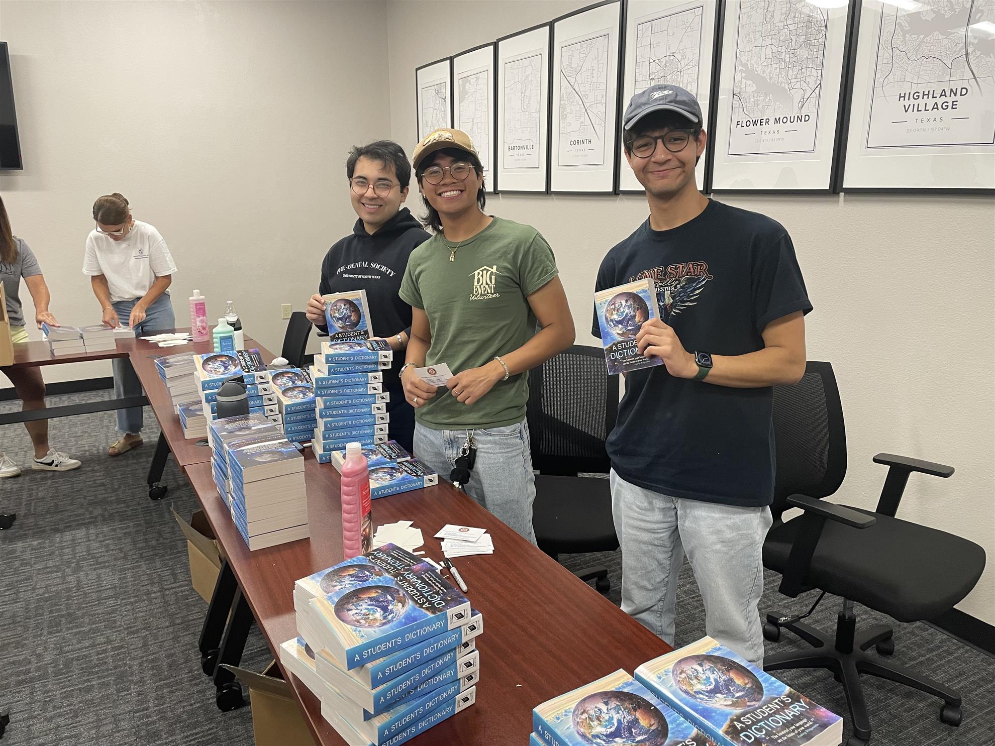 We gathered early for breakfast. Then we placed a Rotary label, including the four-way test, on the first page of the dictionary, with 25 volunteers, including three from the UNT Rotaract Club and two mother/daughter teams from NCL (National Cherry League). We labeled around 2500 Dictionaries.